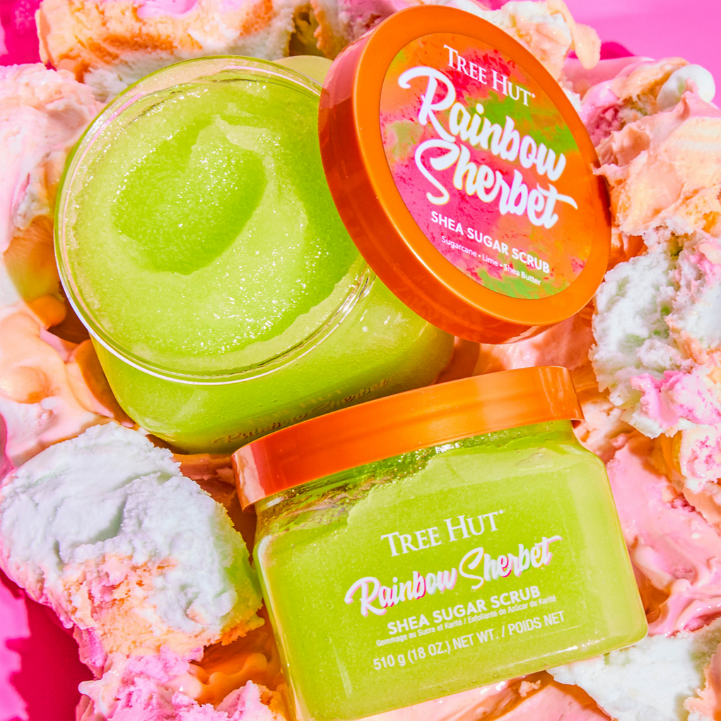 Επαγγελματική απολέπιση σώματος με το TREE HUT Rainbow Sorbet Sugar Scrub, που προσφέρει ήπιο αλλά αποτελεσματικό peeling με ζάχαρη, αφήνοντας την επιδερμίδα απαλή, λεία και ενυδατωμένη. Η μοναδική σύνθεση με shea butter και φυσικά εκχυλίσματα βοηθά στην αφαίρεση των νεκρών κυττάρων, ενώ ταυτόχρονα θρέφει και προστατεύει το δέρμα, προσφέροντας αίσθηση φρεσκάδας και αναζωογόνησης με άρωμα γλυκό και φρουτώδες, εμπνευσμένο από το rainbow sorbet.