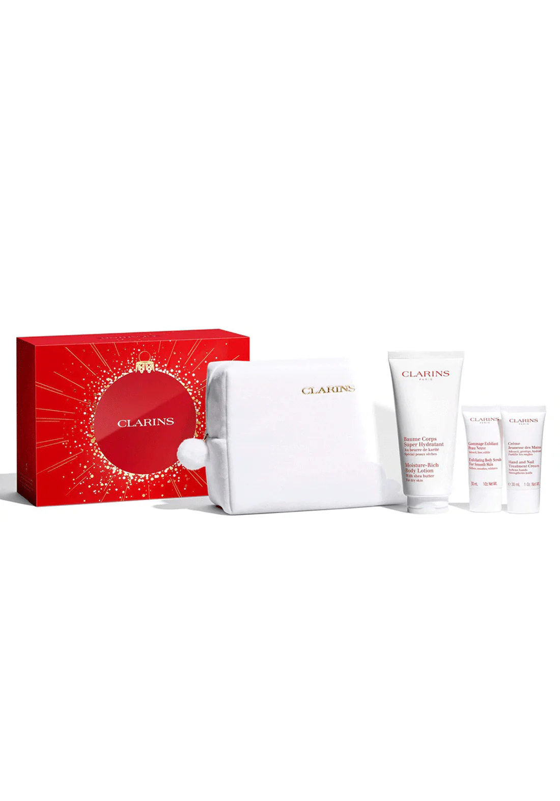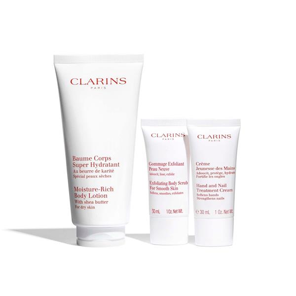 Clarins Baume SetMoisture Rich Body Lotion 200 ml / Exfoliating Body Scrub 30 ml / Hand and Nail Treatment Cream 30 ml /Large Pouch set x 260 ml
