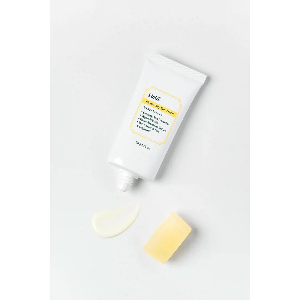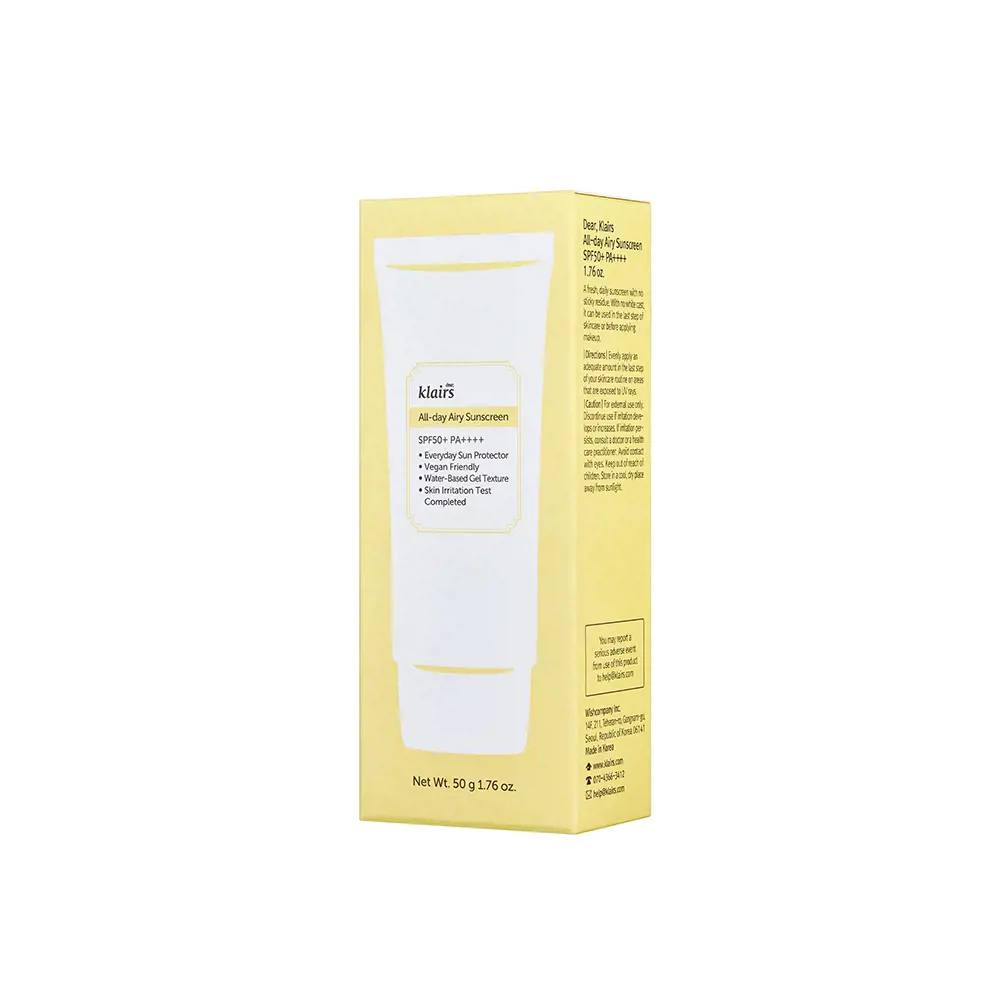 Το KLAIRS ALL-DAY AIRY sunscreen SPF50+ περιέχει φυσικά συστατικά όπως πράσινο τσάι και φίλτρα φωτός για να προστατεύει το δέρμα σας από τις ελεύθερες ρίζες και την οξείδωση. Είναι κατάλληλο για όλους τους τύπους δέρματος και μπορεί να χρησιμοποιηθεί ως βάση για το μακιγιάζ σας. Απλά εφαρμόστε το σε καθαρό δέρμα πριν από την έκθεση στον ήλιο και απολαύστε μια ανάλαφρη προστασία όλη την ημέρα.