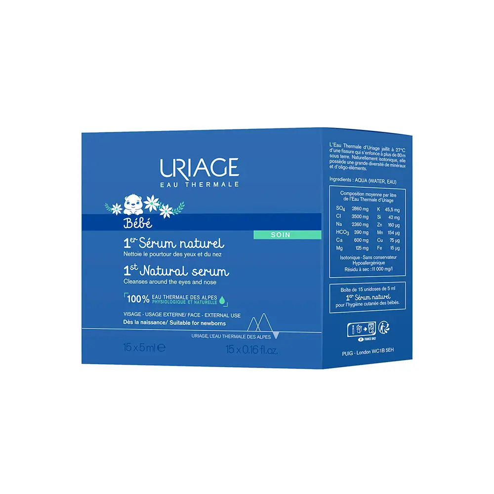 Το URIAGE Physiological Serum είναι ένας αποστειρωμένος φυσιολογικός ορός (ισοτονικό διάλυμα) σε πρακτικές μονοδόσεις των 5ml, εμπλουτισμένος με το φυσικό Ιαματικό Νερό Uriage. Αυτός ο φυσιολογικός ορός είναι ιδανικός για την καθημερινή ρουτίνα περιποίησης και υγιεινής των βρεφών, των παιδιών και των ενηλίκων, ειδικά για τον καθαρισμό της μύτης και των ματιών, καθώς και για την ενυδατική φροντίδα του δέρματος. Η ήπια και ισορροπημένη σύνθεσή του είναι κατάλληλη για την πιο ευαίσθητη επιδερμίδα και βλεννογόνους.